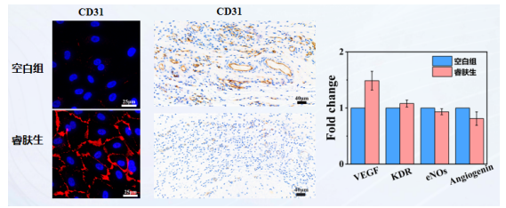 诱导生长因子VEGF的产生和聚集,使内皮细胞成血管标志物CD31表达明显上调,促使血管数量增多,为伤口愈合提供O2、必要的营养等,从而加快伤口愈合速度。