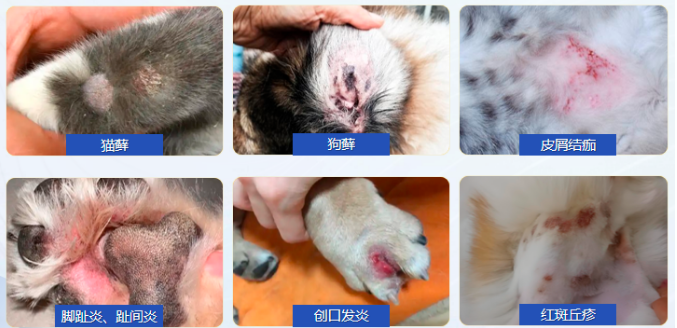 猫藓狗藓、皮肤瘙痒、擦伤、创口愈合、脚趾炎、趾间炎等细菌感染