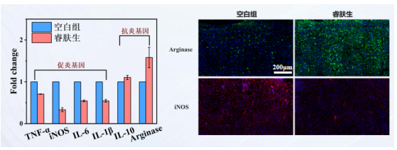 促使巨噬细胞的促炎因子表达下降、抗炎因子明显提升,加快由M1型向M2型的转化,有效降低创面的炎症反应,有效缩短创面的炎症期。